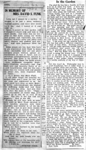 Burton Coon writes about two gardens in his articles, “In the Garden” and “Memory of Mrs. David S. Funk”.