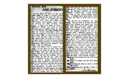 Burton Coon reminisces about the old peach tree “in the little lot back of the barn” and an old friend, the postman Robert G. Moore, in his article entitled “Here We Are, Robert”.